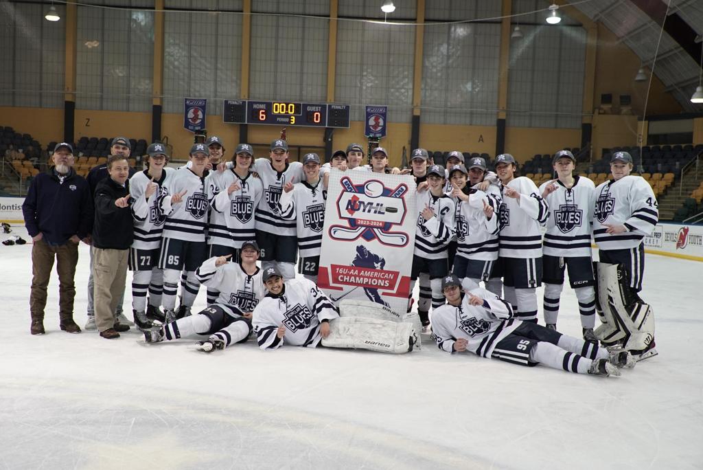 16 A National Blue - As the second overall seed entering playoffs, the boys had matchups set against Princeton Tigers, Red Bank Generals and Montclair Blues Grey. The team went through round robin play with a 2-1 record, including a 3-1 win over Princeton, 6-3 loss to Red Bank and a 4-2 win over Montclair Grey, which earned them a spot in the finals. Although the boys fell 3-1 to Red Bank in a tough battle, second place earned them a spot in the AAHA 16 A tournament in March 2024.